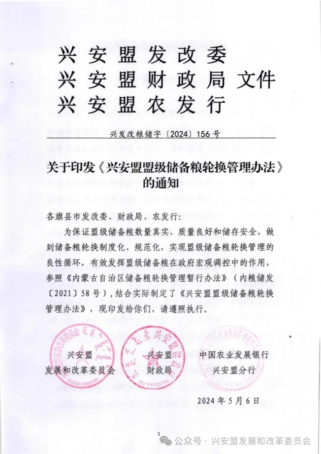 为适应粮食安全保障工作新形势、新任务、新要求,充分压实盟级储备粮主体责任和监管责任,用制度管理规范盟级储备粮轮换,日前,兴安盟发展和改革委员会、兴安盟财政局、中国农业发展银行兴安盟分行联合修订印发了《兴安盟盟级储备粮轮换管理办法》,确保盟级储备粮数量真实、质量良好和储存安全。