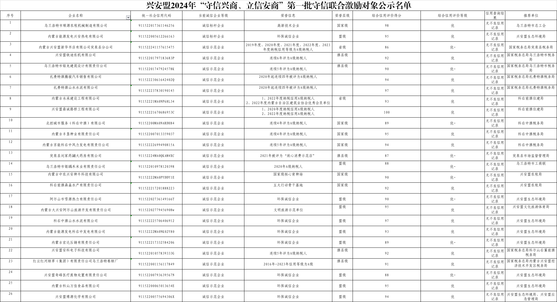 同时,为加大对诚信主体激励力度,褒扬和激励诚信行为,促进市场主体依法经营,在法治轨道上不断完善守信激励机制,营造知信、用信、重信、守信的氛围。经兴安盟各行业主管部门和各旗县市社会信用体系建设牵头单位的积极推荐,企业自愿申报,我委结合《国家公共信用综合评价结果》和《内蒙古自治区诚信典型企业选树管理办法》,严格审核并核对内蒙古自治区公示2024年第五批诚信典型名单后,确定26家企业为兴安盟第一批“立信兴商 守信安商”守信联合激励主体(后附名单),并形成流程化、常态化的诚信榜单发布机制。