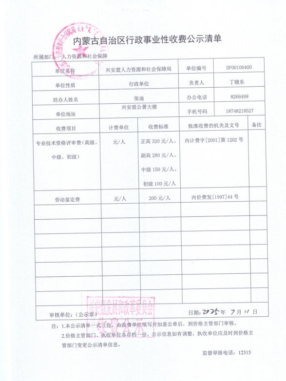内蒙古自治区行政事业性收费公示清单(兴安盟人力资源和社会保障局)