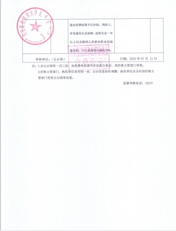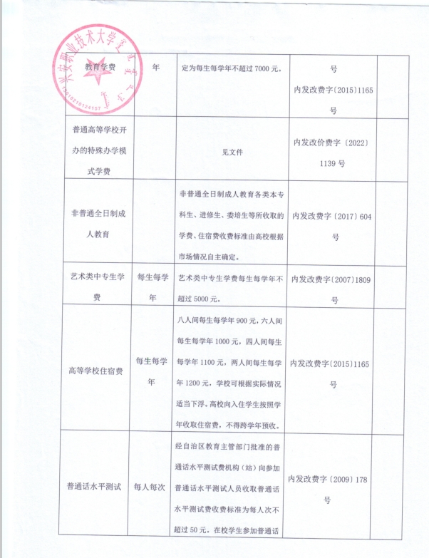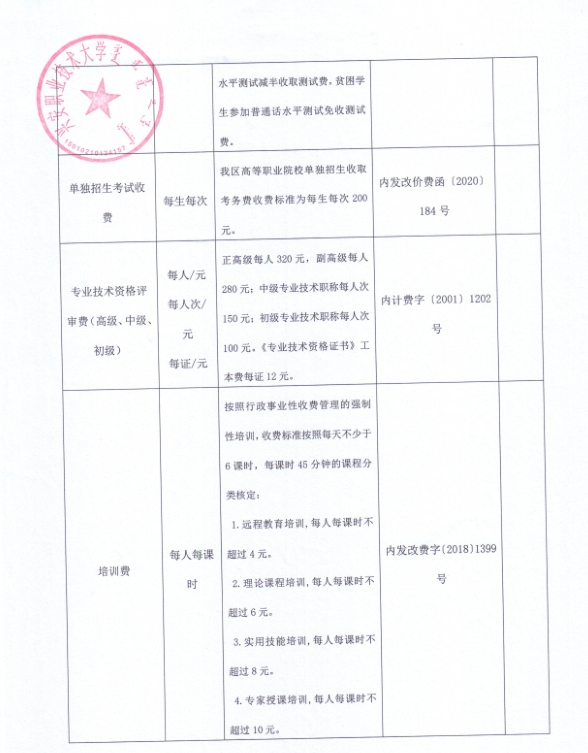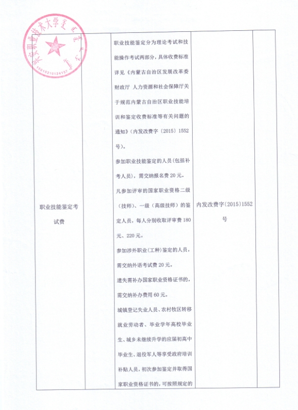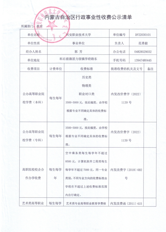 内蒙古自治区行政事业性收费公示清单(兴安盟职业技术大学)