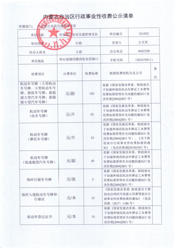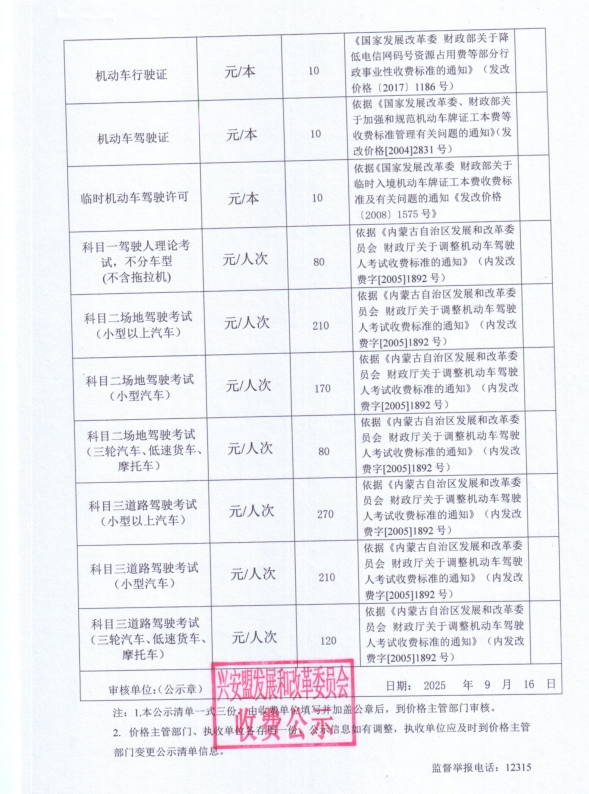 内蒙古自治区行政事业性收费公示清单(兴安盟公安局交通管理支队)