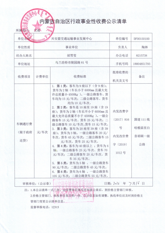 内蒙古自治区行政事业性收费公示清单(兴安盟交通运输事业发展中心)
