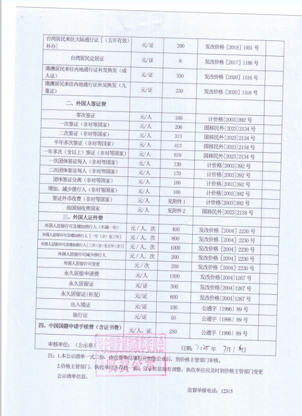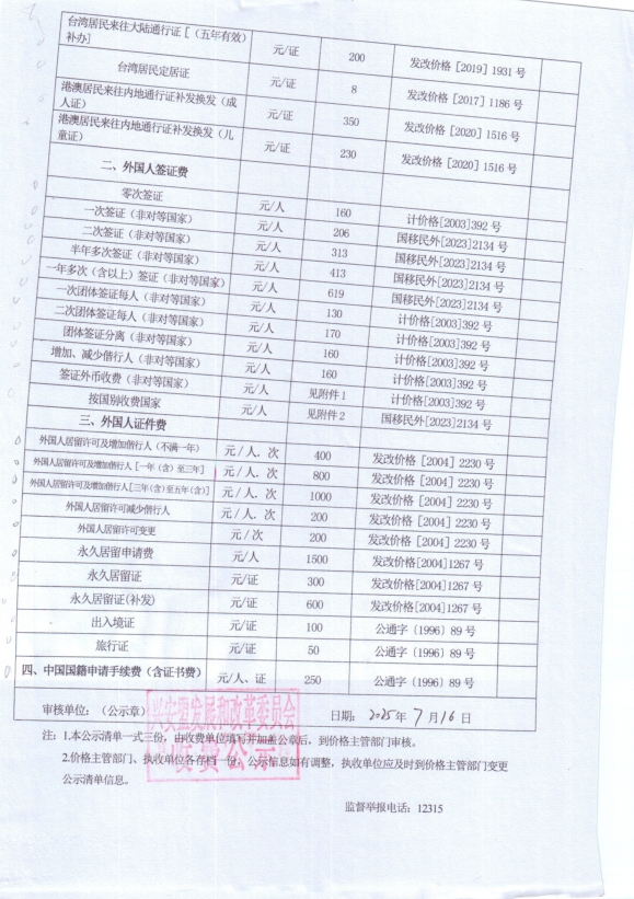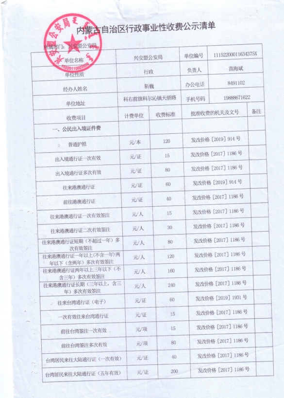 内蒙古自治区行政事业性收费公示清单(兴安盟公安局)