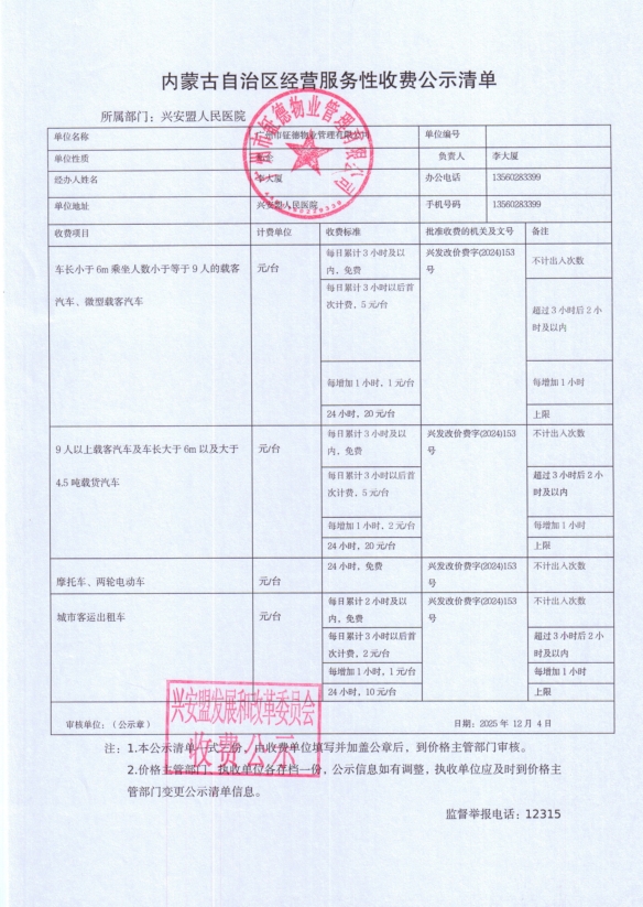 内蒙古自治区经营服务性收费公示清单(兴安盟人民医院)