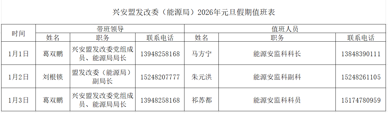兴安盟发改委(能源局)2026年元旦假期值班表