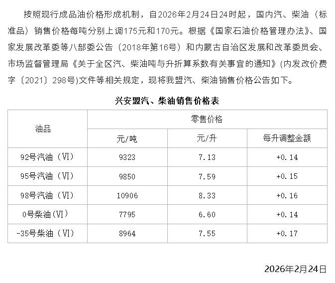 兴安盟成品油价格调整公告(2026.2.24)